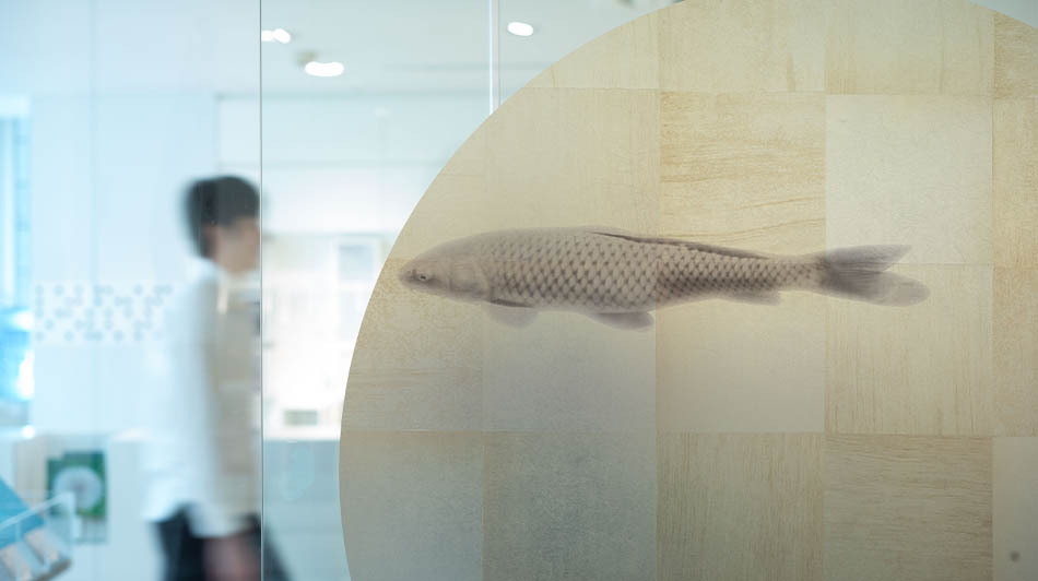 スリガラス調や透明色、反射シートにカットやプリント加工を組み合わせることで、多彩で独自のデザインが可能に。透明感や光の反射、繊細なラインなど、素材の特性を活かした表現のアイデアをご覧いただけます。
