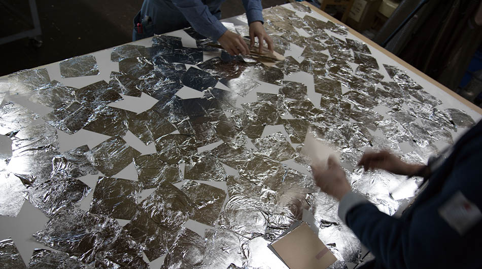 舞箔シートは、金属箔をランダムにあしらうことで、動きのある表情豊かな質感が特徴のシートです。職人が一枚一枚手作業で仕上げ、繊細さと動きのある美しさを実現しています。日本の美意識に根ざした素材が、世界に一つだけの特別な装飾素材として、上質な空間づくりを可能にします。