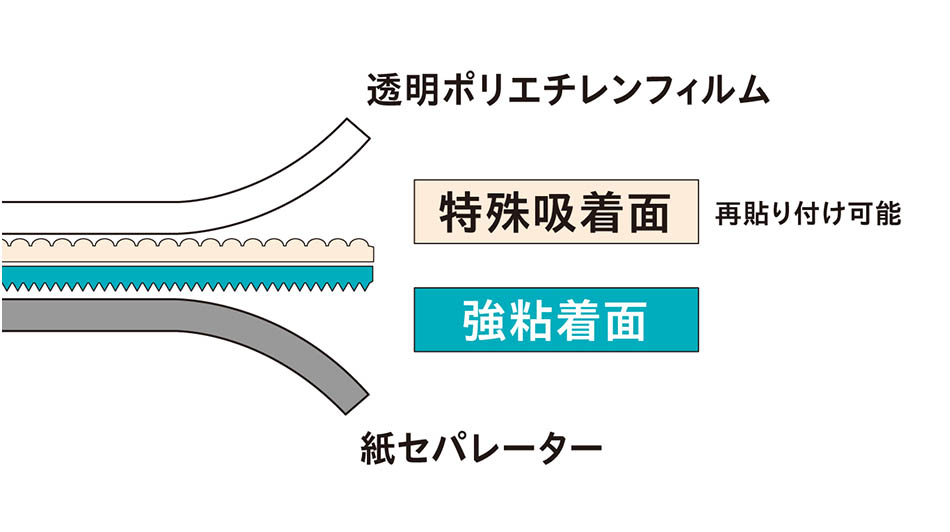 STマットは、片面が【特殊吸着】、もう片面が【強粘着】の構造を持つ両面テープです。吸着面は強力に密着しますが、空気を入れることで糊残りなく簡単に剥がせます。汚れによって吸着力が低下した場合でも、水拭きすることで再び吸着力が回復します。さらに、平滑な面であれば材質を問わず使用可能です。