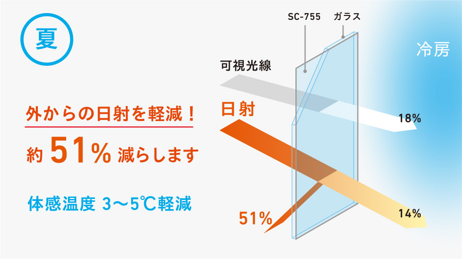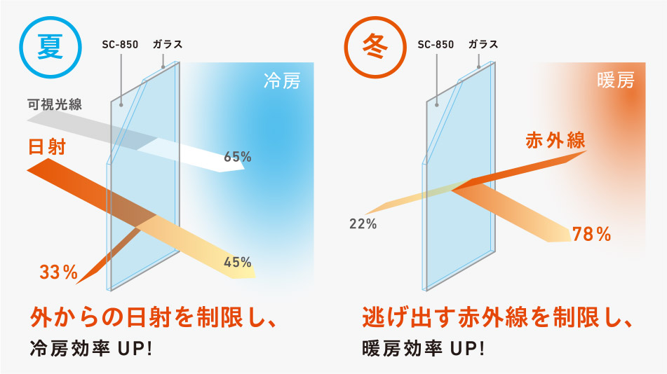 「SC-850(サーモZC)」は、外からの日射を抑制する「日射調整効果」と、室内の熱を逃がさない「低放射効果」を併せ持っています。夏の暑さ、冬の寒さの中でも空調効率を高め、1年通じて快適にお過ごしいただけます。
