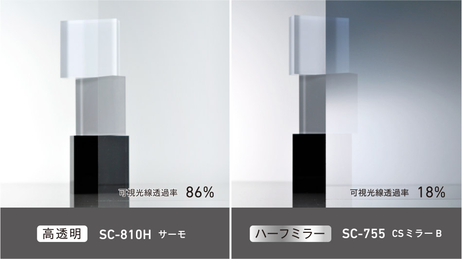 セーフティコントロールをガラスに貼るだけで様々な効果が得られる、機能性ウィンドウフィルムです。「ガラス破損時の飛散防止」、「紫外線カット」、「断熱効果(省エネ)」など空間に求められる機能に応じて、製品をお選びいただけます。各製品ごとに機能性が異なりますので、カタログにてご確認ください。また、透明フィルムから色付きフィルムまで、意匠性に合わせてお選びいただけます。
