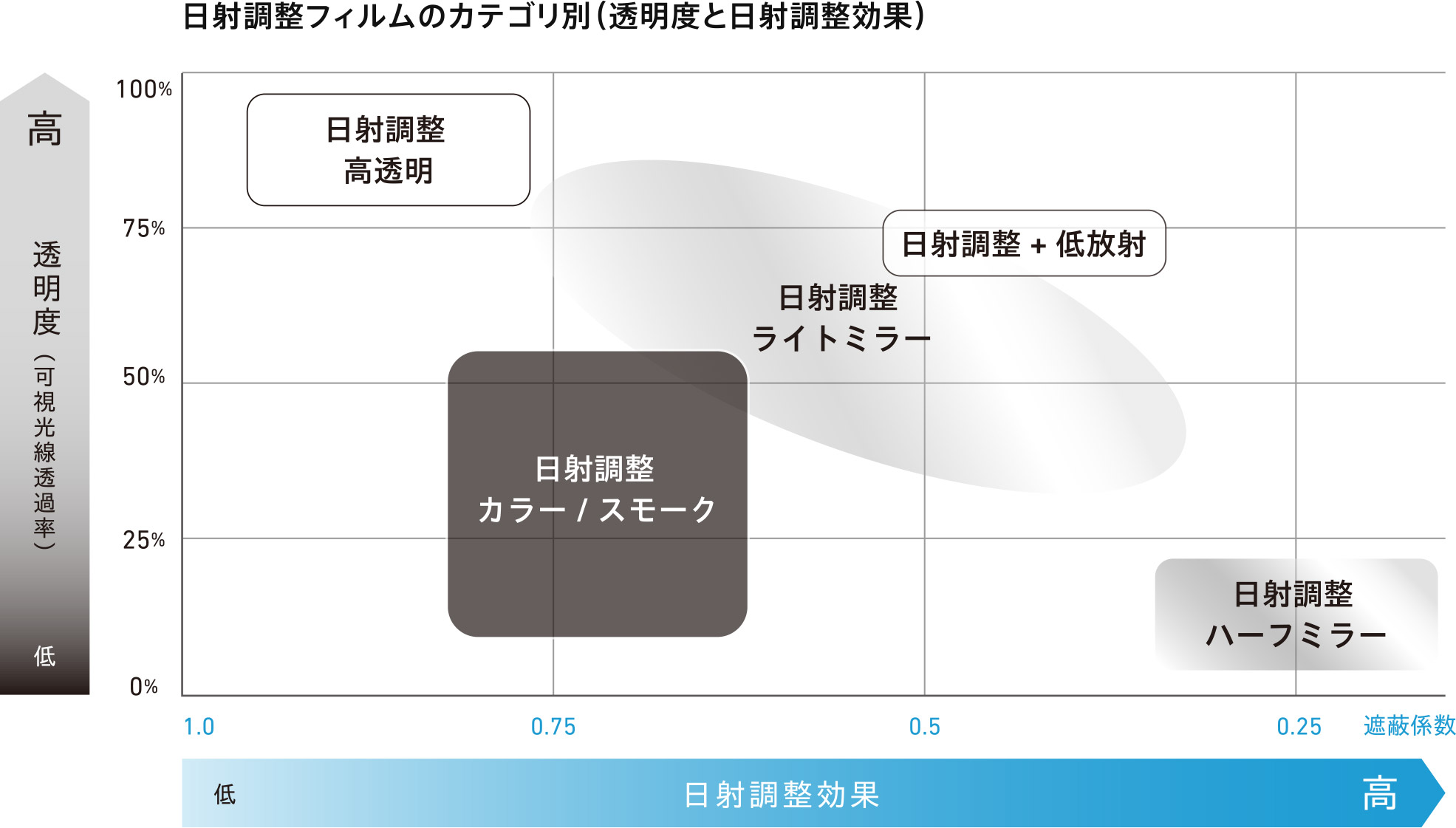 日射調整効果とは、夏場などに日差しによって室内の温度が上昇することを軽減する機能をさします。熱線を遮ることで、冷房効率を高める効果があります。フィルムの色や金属膜を使い日射を抑えるため、効果の高いフィルムは基本的に透過度が低くなります。貼ろうとしている場所に応じて、「機能を重視」するのか、それともフィルムの「透明性を重視」するのかを決めましょう。