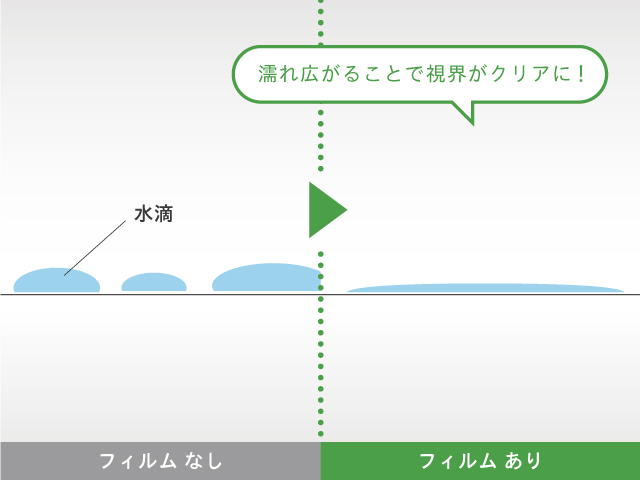 超親水フィルムとは、親水性により水滴が濡れ広がることで、