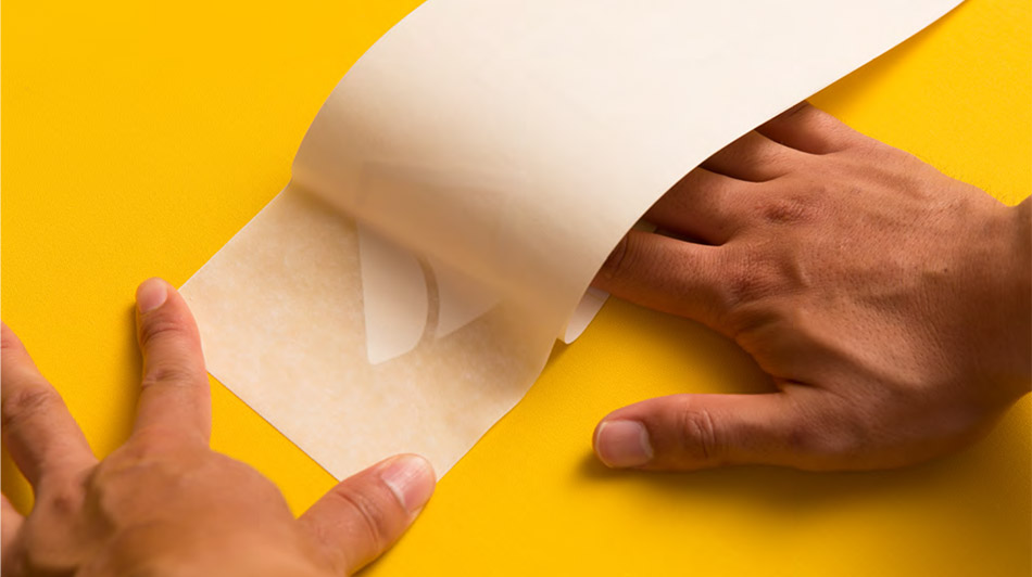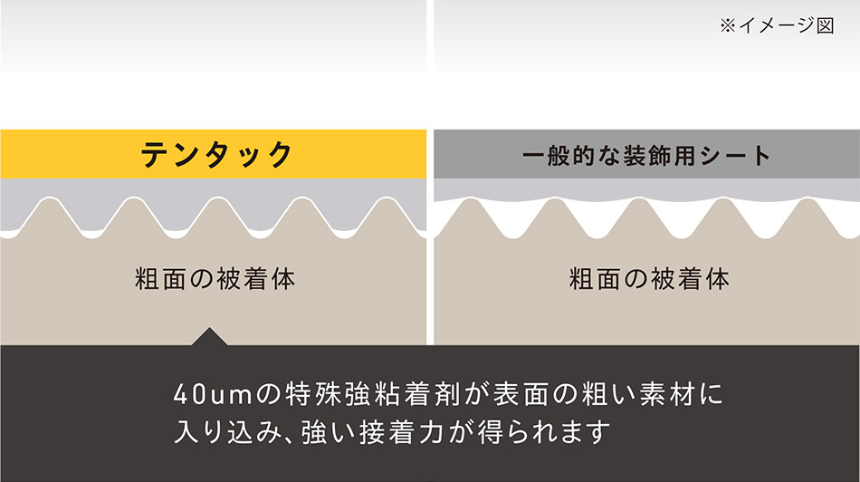 テンタックの粘着剤は40μmの厚みがあるだけでなく、特殊な強粘着剤なので、表面の粗い素材にも貼り付け可能です。一般的な装飾用シートの貼付けが難しい場所でも、ご活用いただけます。